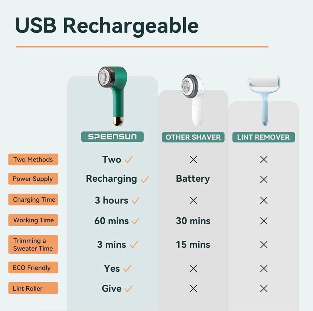 USB Rechargeable Fabric Shaver:The lint shaver is rechargeable and no battery is required which is environmental friendly and saves your money. You can take the cordless lint remover to anywhere after it'sfully charged,or shave the fabric while charging,and you just need to plug the cable into a charging device or a power bank or even a laptop and switch the fabric shaver on.